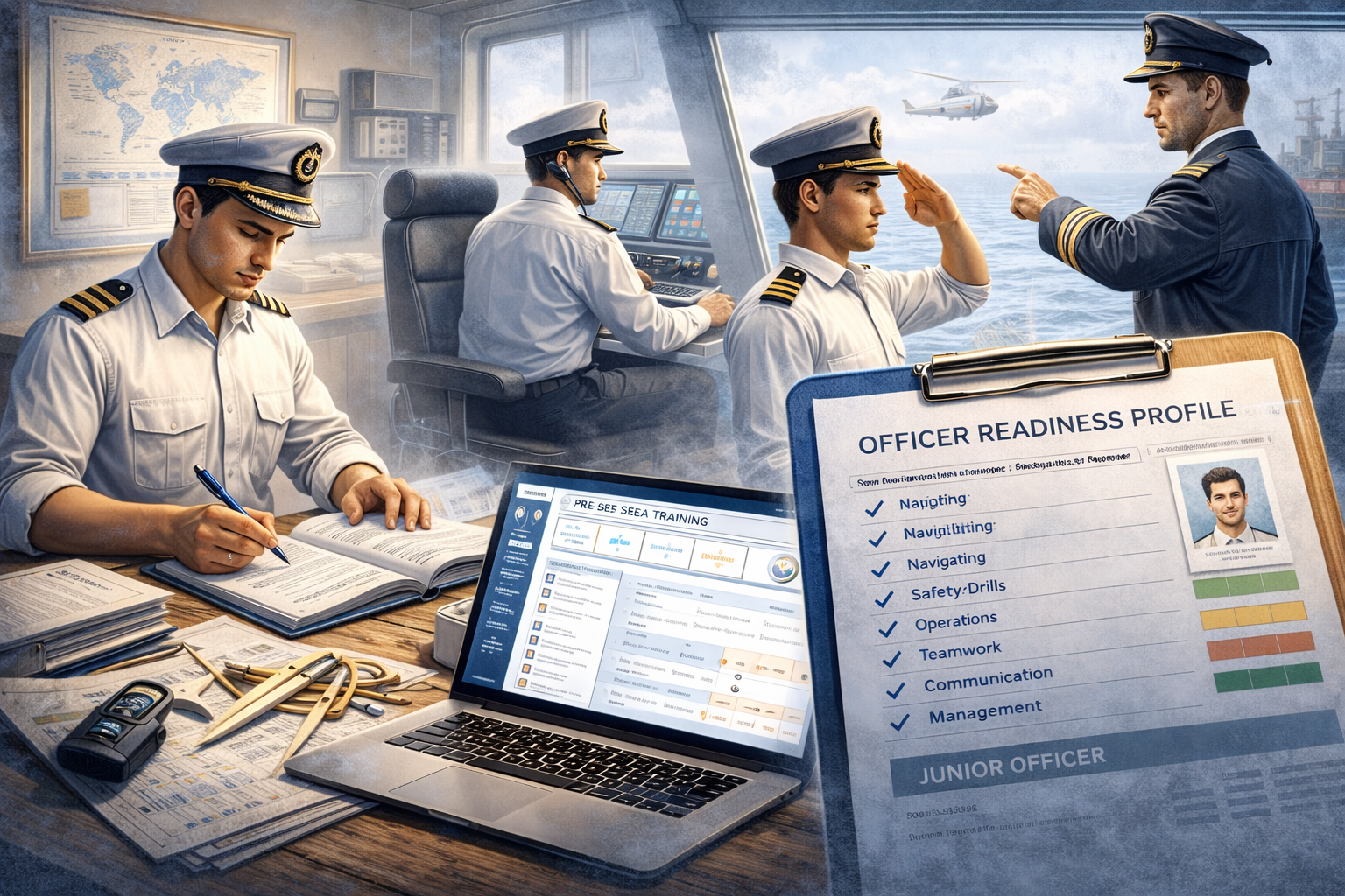 Pre-sea preparation, onboard practice monitoring, corrective training triggers, and a final Officer Readiness Profile—contract-ready junior officers.